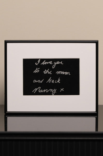 Every design is traced, refined and embroidered stitch-by-stitch to honour the original handwriting or artwork. Artwork creation takes up to 14 days before shipping.